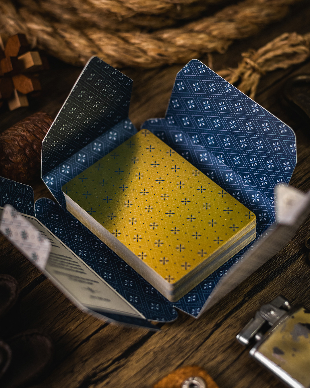 In particular, its construction draws inspiration from wrappers used before the advent of contemporary packaging items, such as today’s tuck boxes. The Club Deck box is a hybrid – a blend of styles – so we referred to it as a tuck wrapper. It features multiple layers and details to explore including, on the inside, a brief introduction to the project, an initial version of the back design, and a rich blue pattern. Notably, the box assembly does not require glue, adding a touch of elegance in terms of functionality.