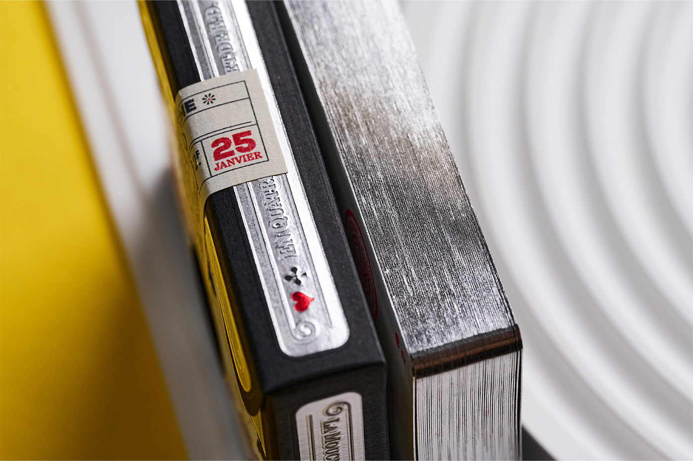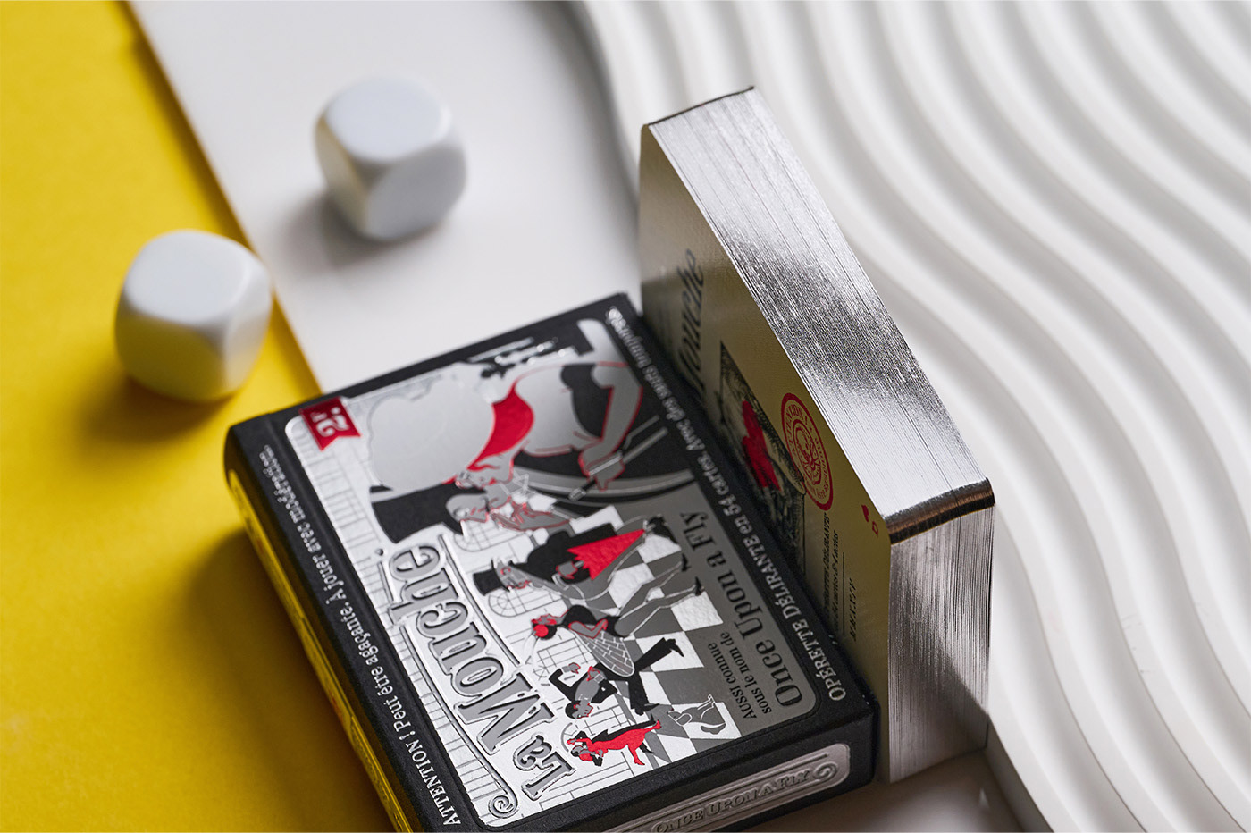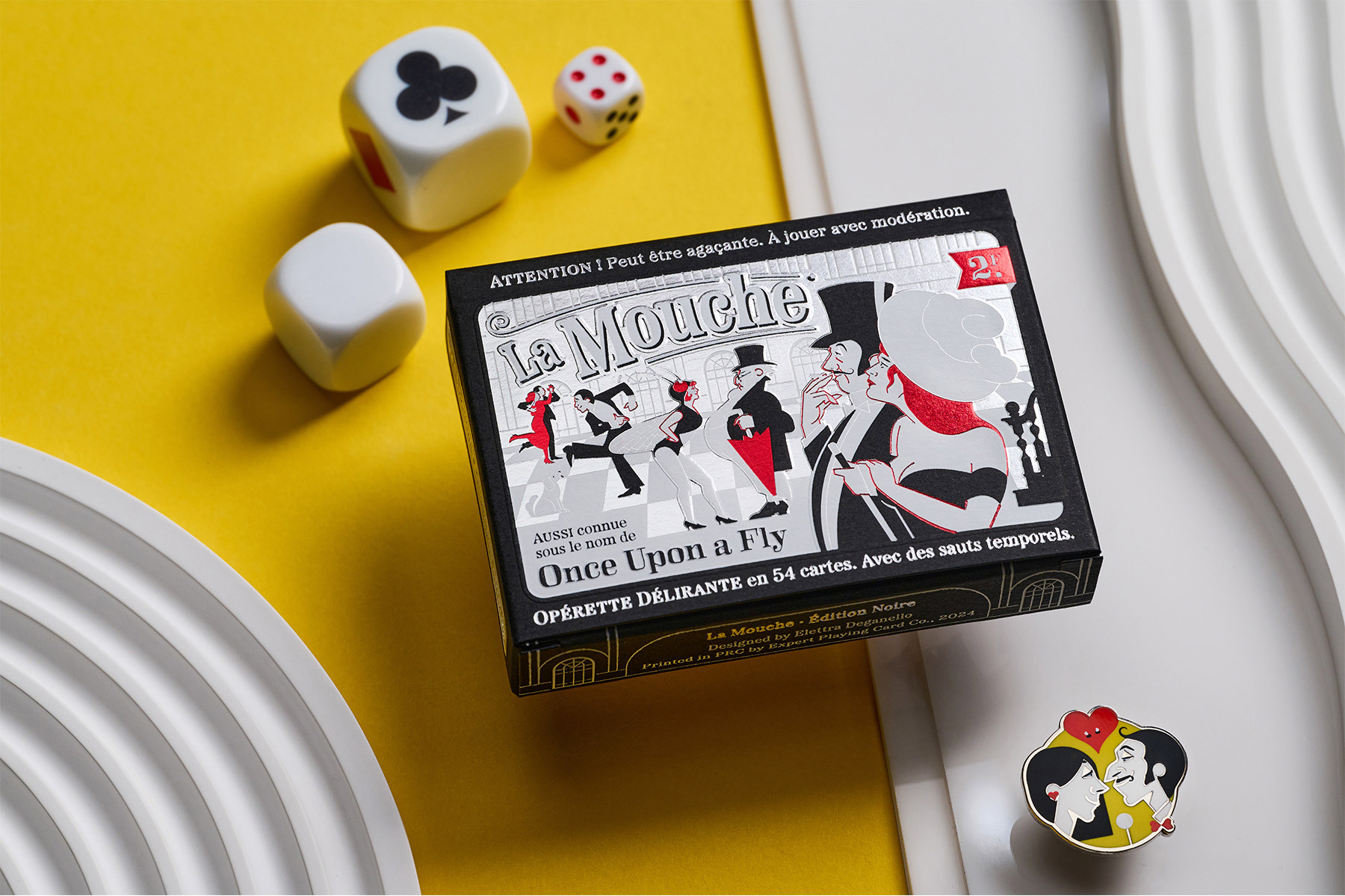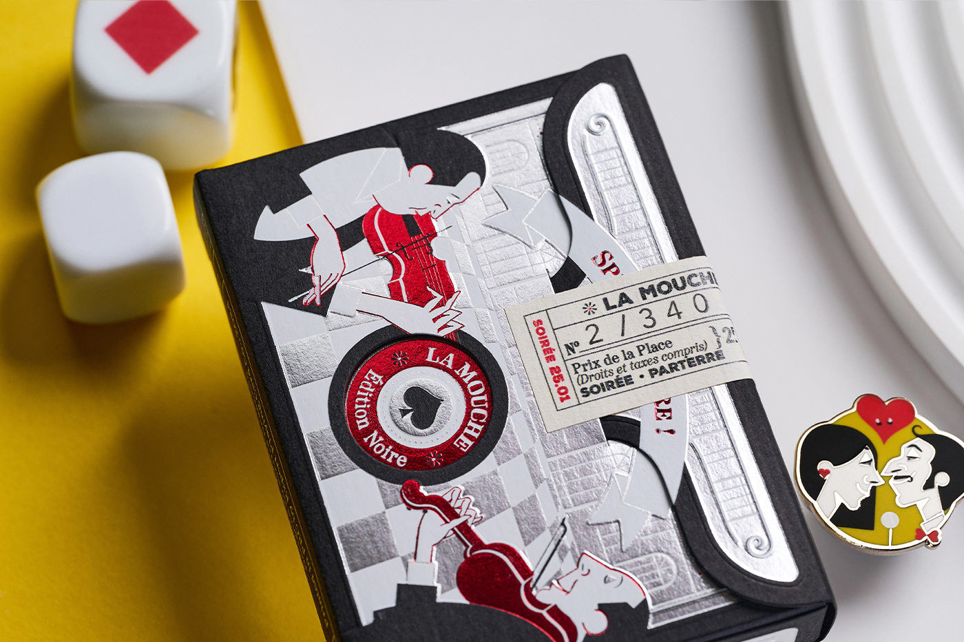 La Mouche Noire is the deluxe edition of La Mouche. The tuck box, inspired by the charming aesthetic of vintage French posters, is completed with a hand-stamped seal resembling an event ticket with numbered, limited seating. Like the Blanche deck, La Mouche Noire has been printed by Expert Playing Card Co. on classic linen-finish stock, with the card faces showcasing silver cold foil. Additionally, being more limited, the Noire edition features silver gilded edges. The custom-shaped tuck box has been manufactured in Italy by Boschiero & Newton with silver, red, and white hot foil on high-quality Fedrigoni paper stock, enhanced by detailed embossing.