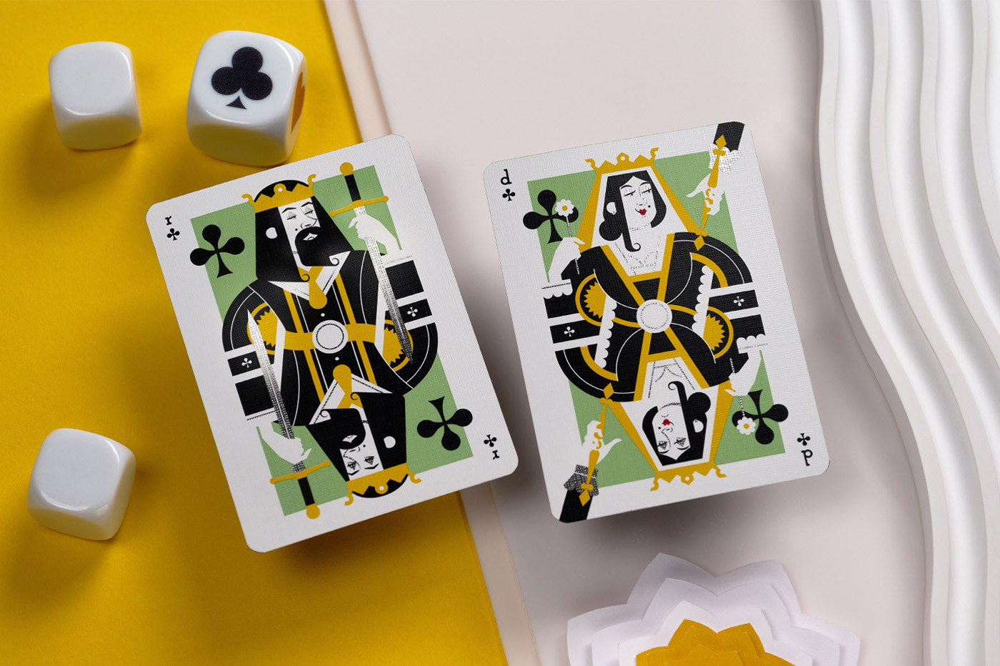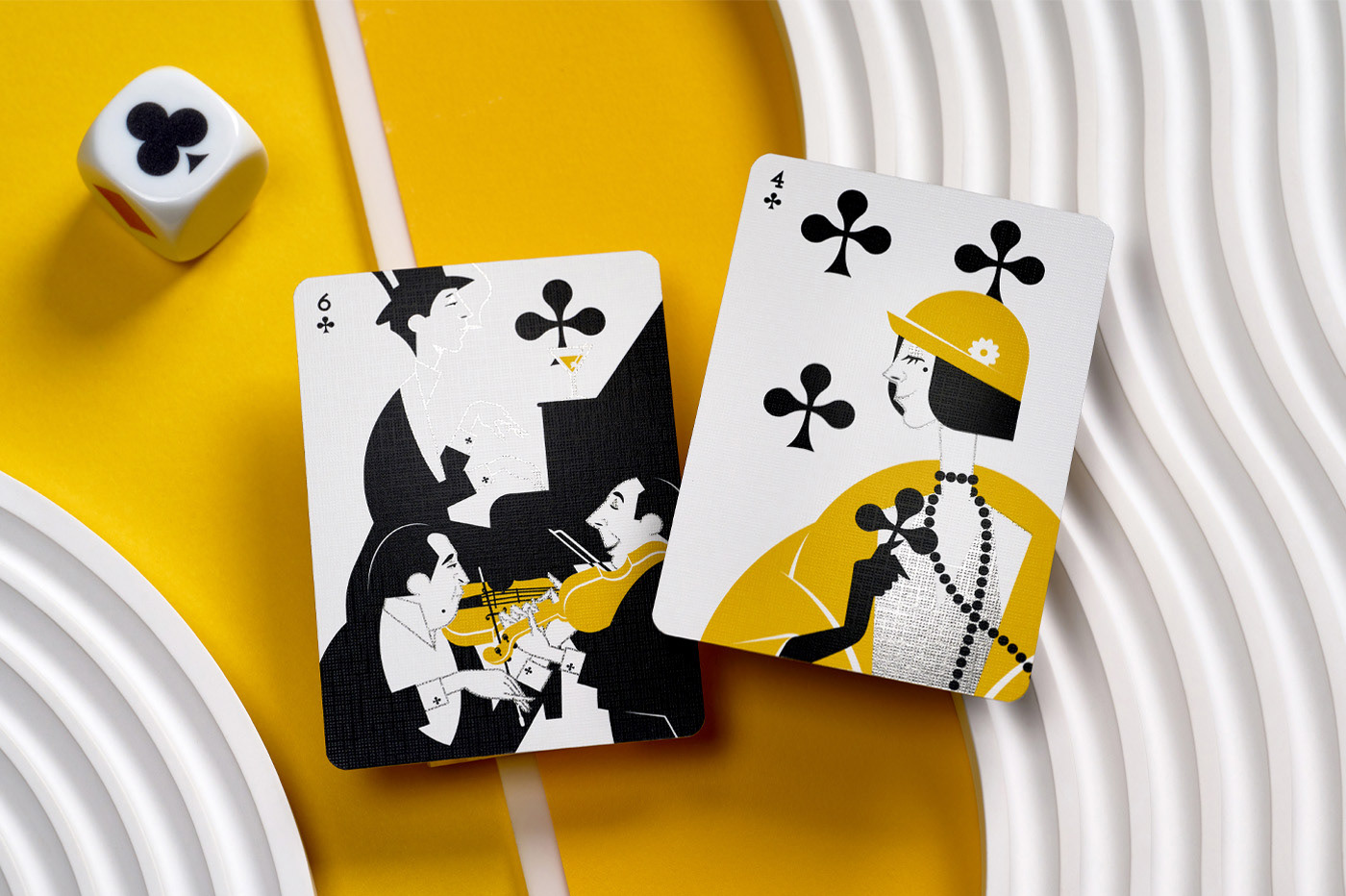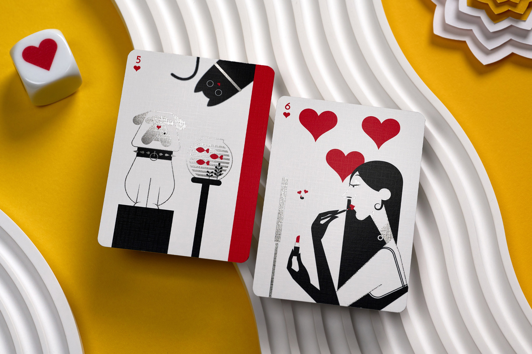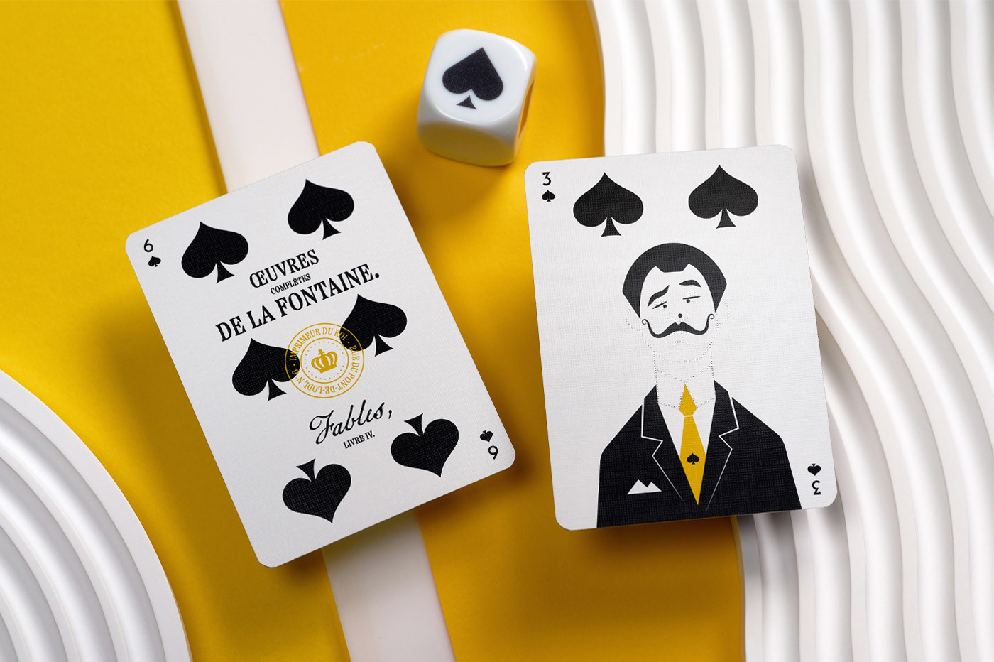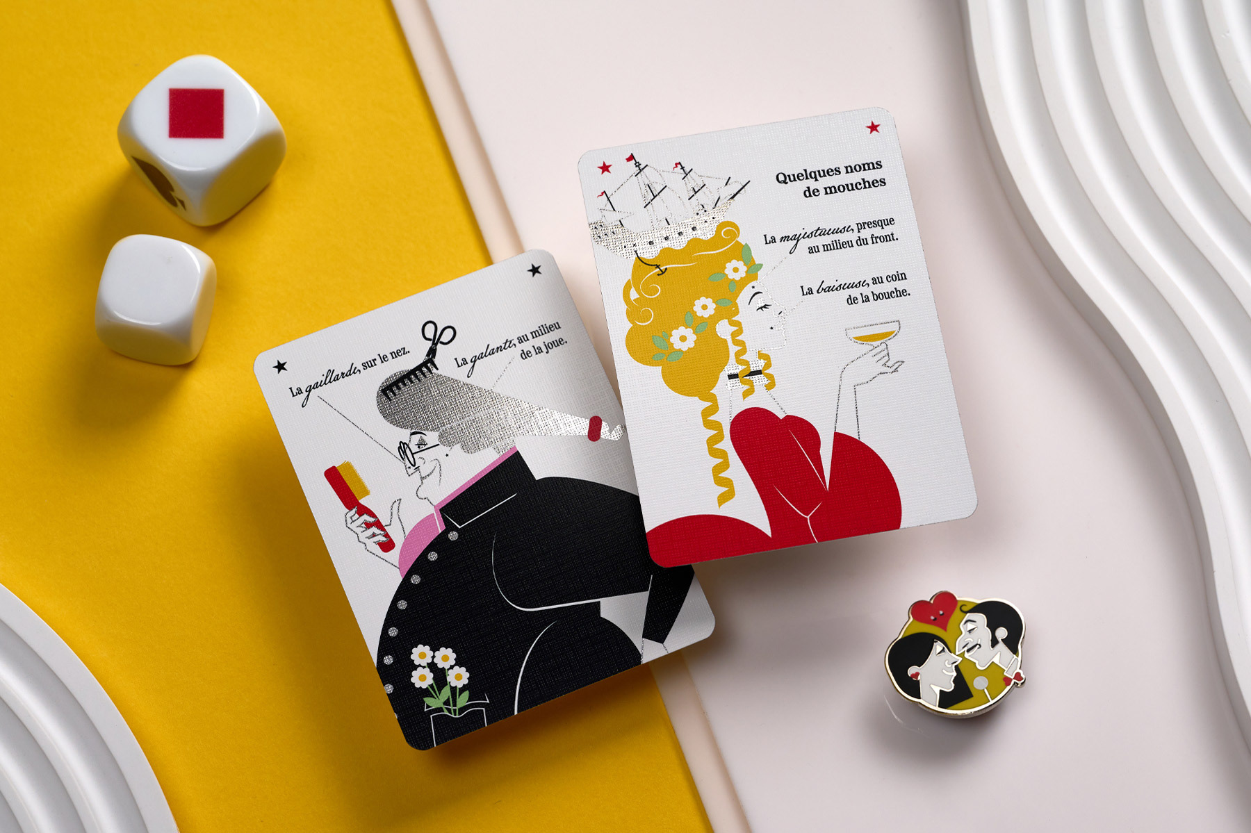 Throughout the faces and reverse of the cards, you will find numerous references to repurposed playing cards from the past, as well as nods to old card games, art, literature, music, and more — all tied together by la mouche.