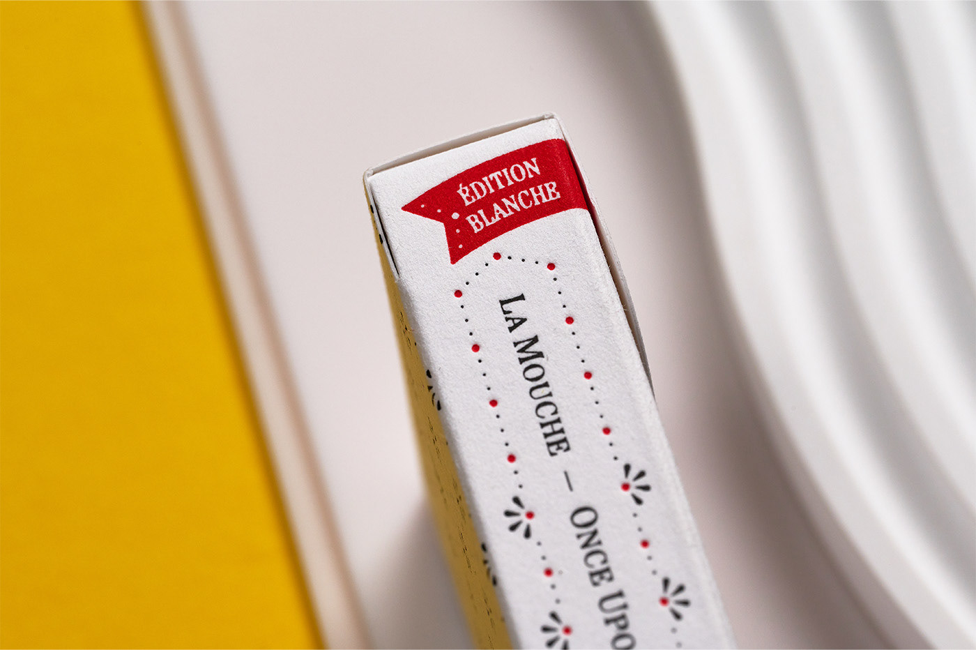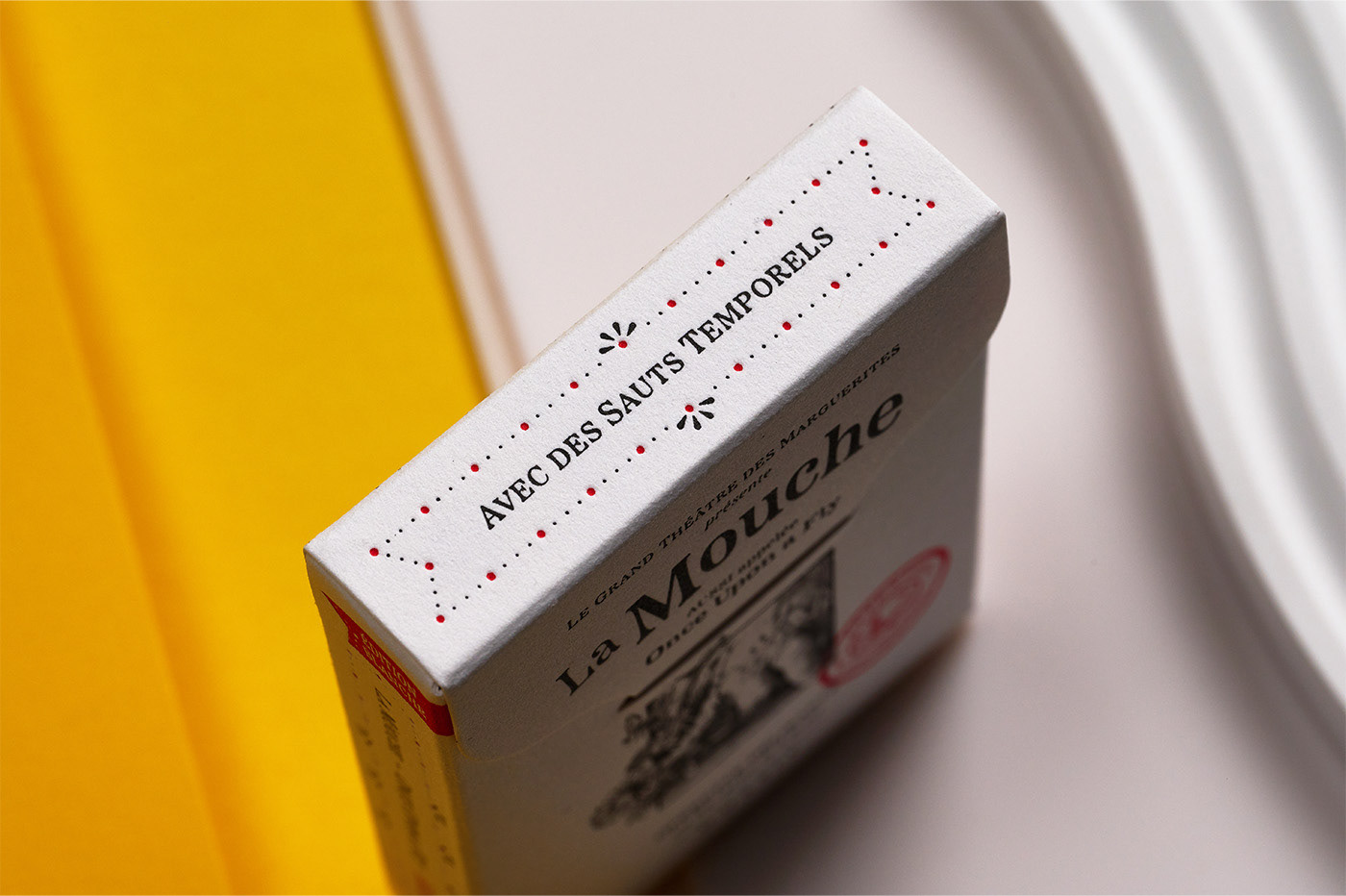 La Mouche Blanche is the classic edition of La Mouche and has been printed by Expert Playing Card Co. on their classic linen-finish stock, featuring silver cold foil on the faces. The custom-shaped tuck box, inspired by an opera libretto and echoing vintage packaging designs, has been manufactured in Italy by Boschiero & Newton using letterpress printing on high-quality Gmund Cotton paper stock