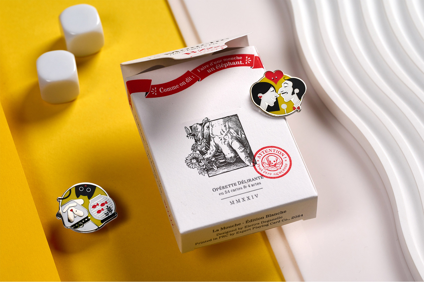 La Mouche is a 54-card poker-sized custom deck narrating the adventures of a mischievous fly. Successfully funded on Kickstarter in January 2024, the deck is now available in two editions: La Mouche Blanche and La Mouche Noire.