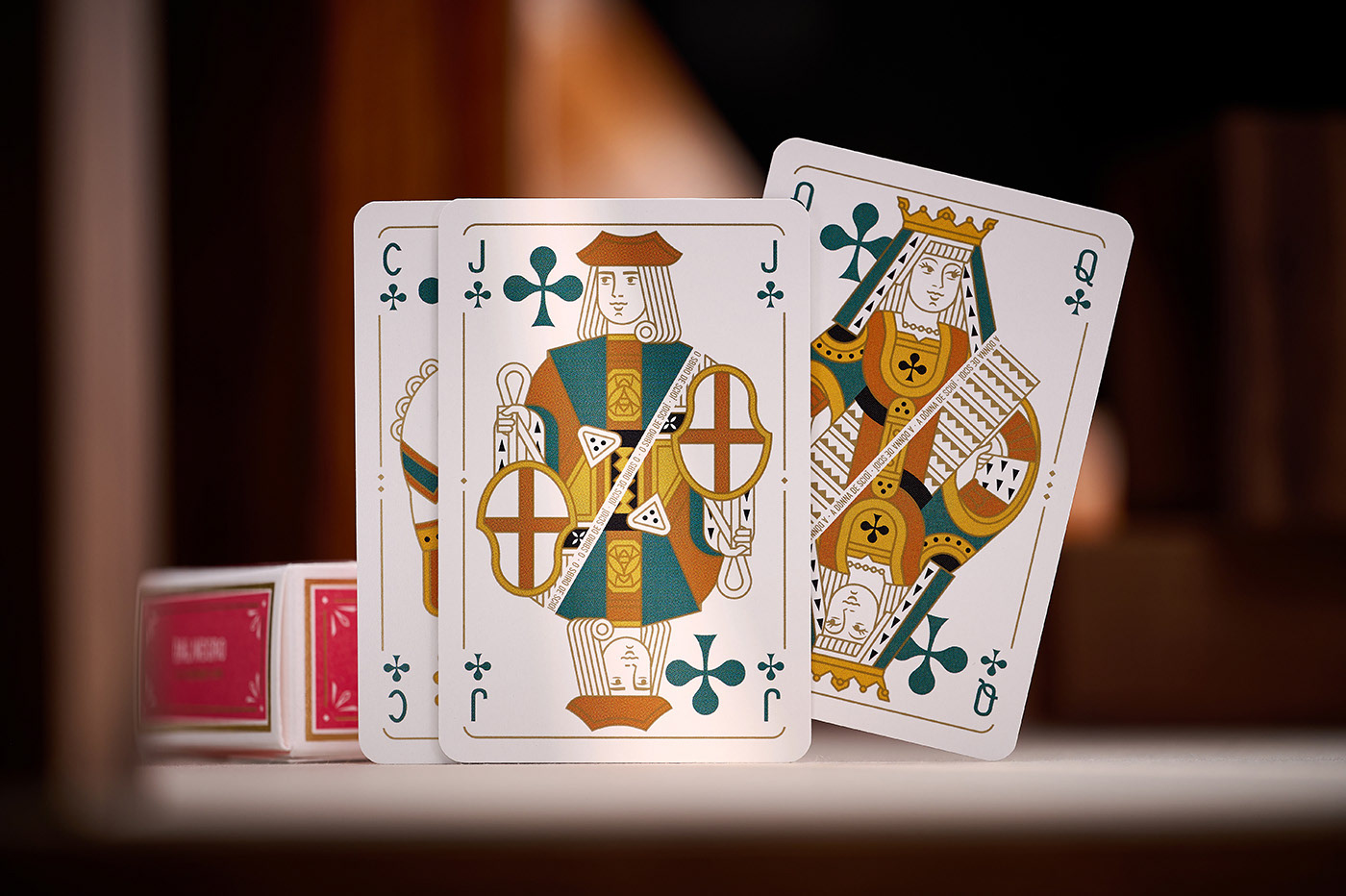 The Ace of Hearts, being the most prominent of the four aces, draws inspiration from a Bolognese tarot made by Genoese cardmaker Solesio in the 1820s and pays homage to the historical tax stamp once required on playing cards. The design incorporates an image of Janus, accompanied by the Latin inscription: Janus, primus rex Italiae de progenie gigantum, qui fundavit Genuam tempore Abrahae (Janus, first king of Italy from the race of giants, who founded Genoa in the time of Abraham) – a direct reference to an inscription from Genoa’s San Lorenzo Cathedral.